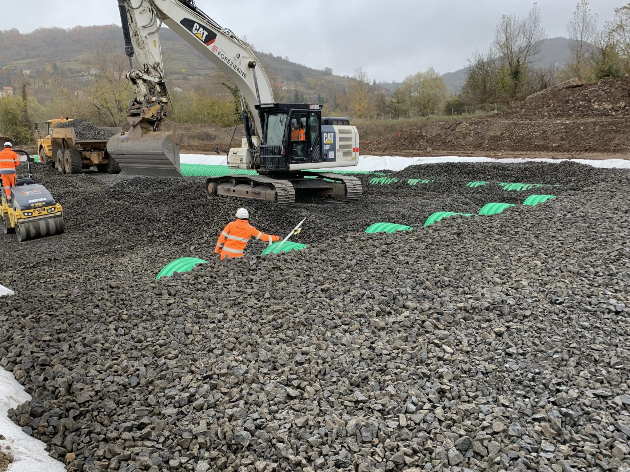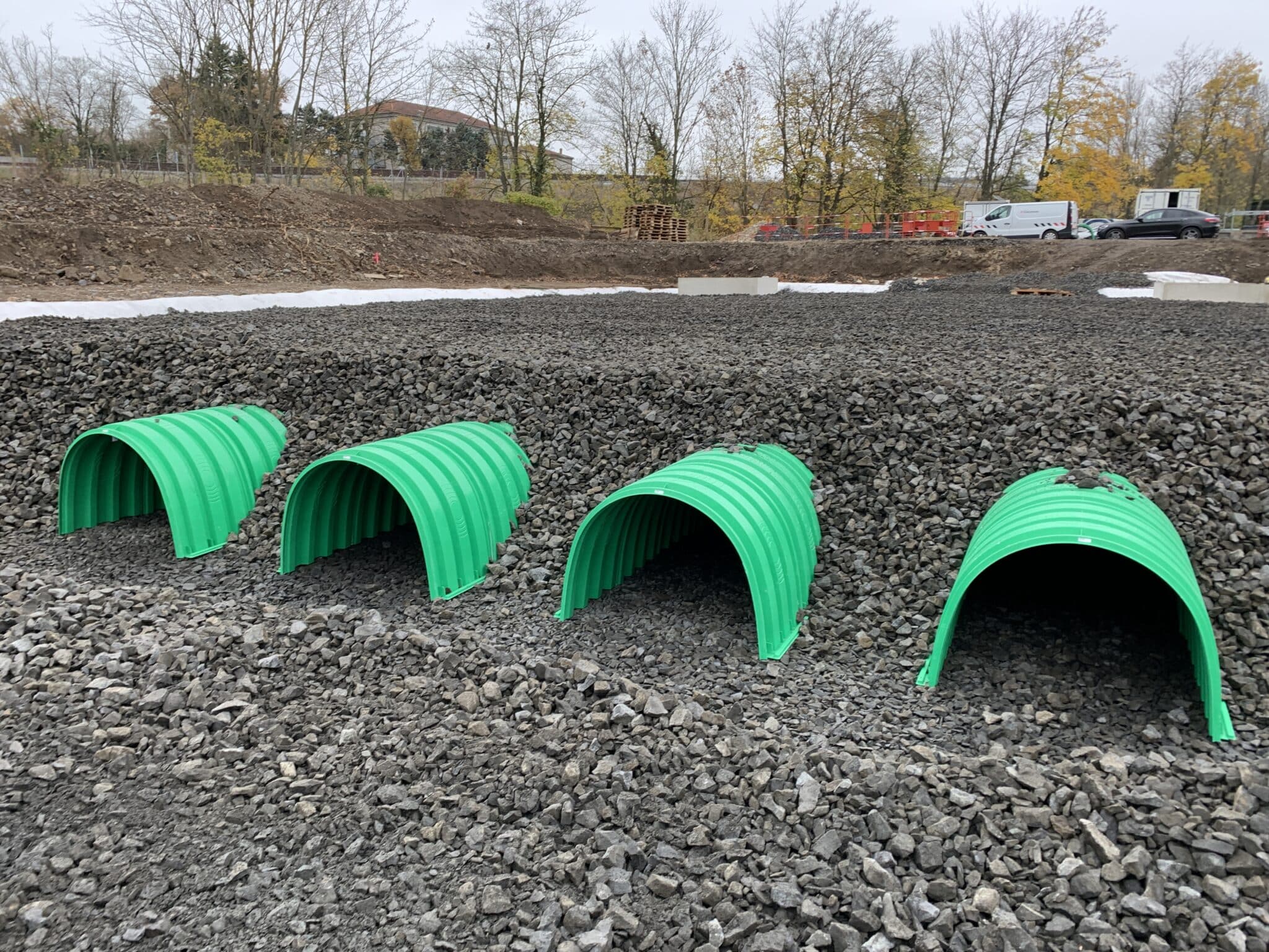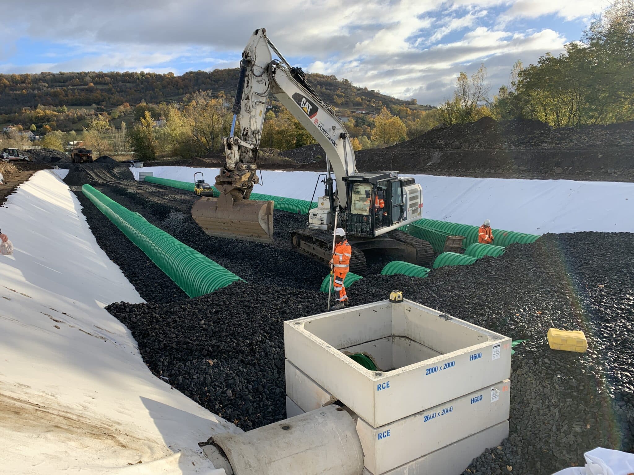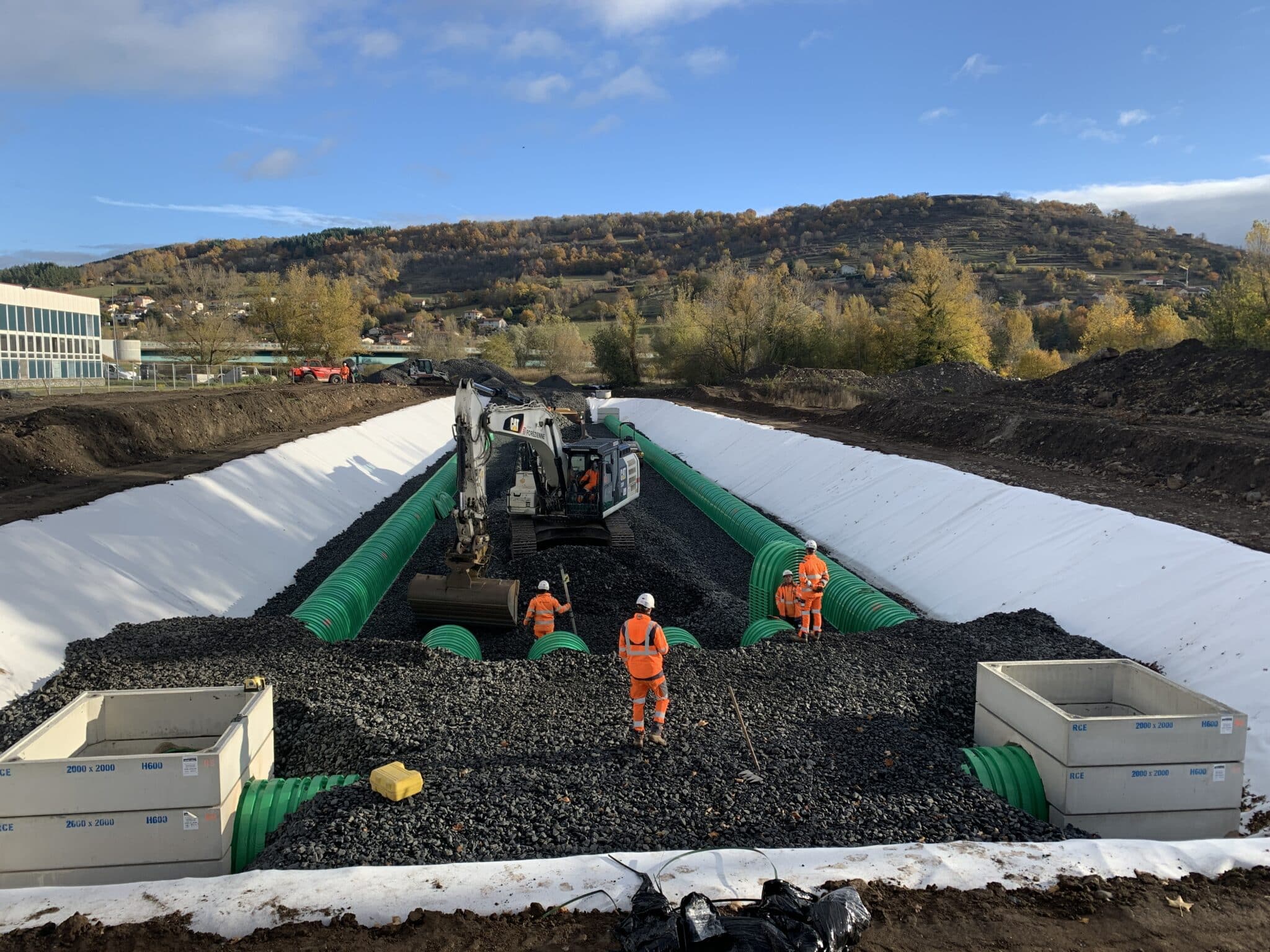 Installation d’un bassin de rétention des eaux pluviales de 2600m3 en chambres modulaires TRITON S22 au PUY EN VELAY (43), par les équipes d’EIFFAGE LA FOREZIENNE, sur 2 niveaux.
