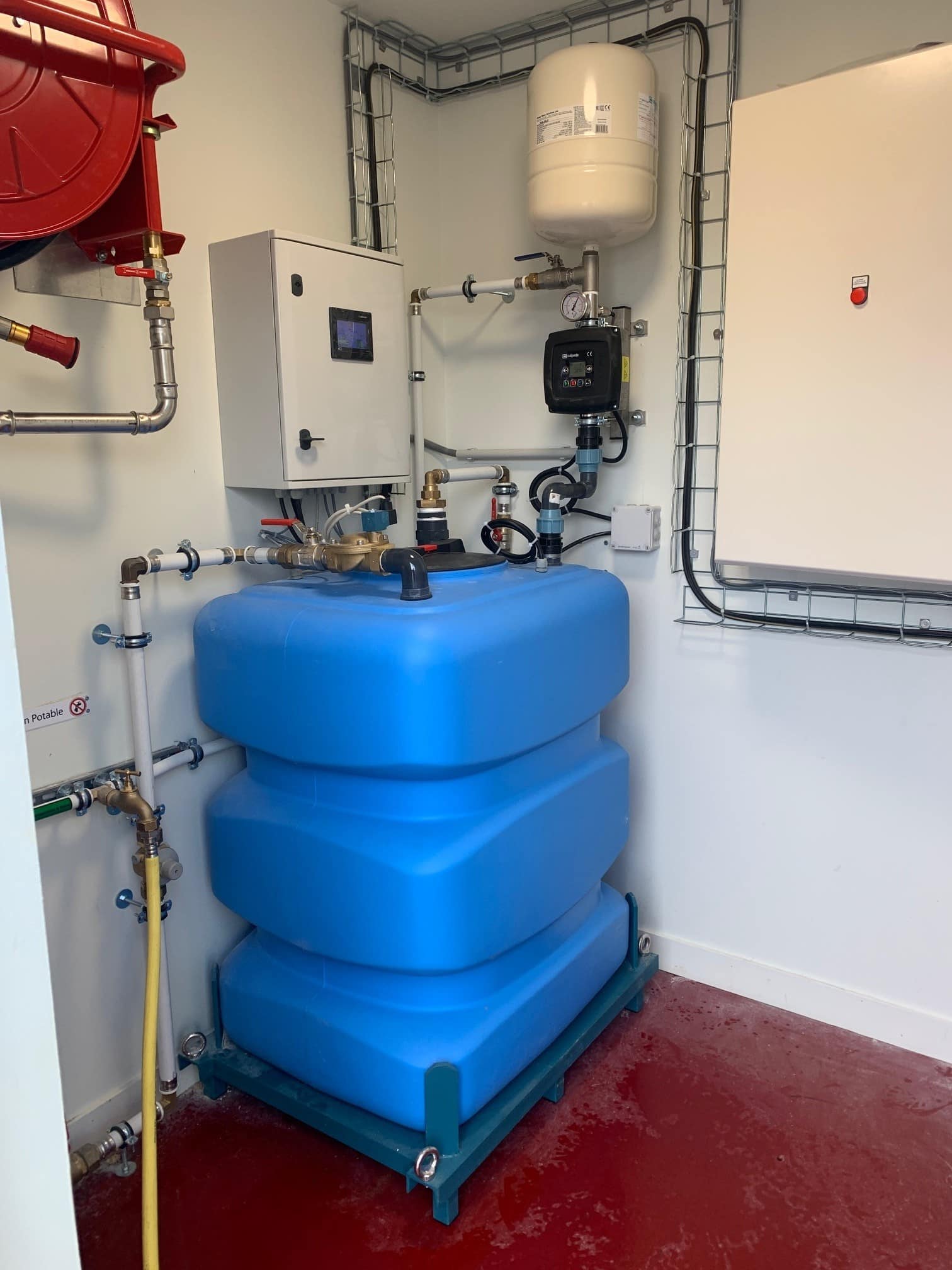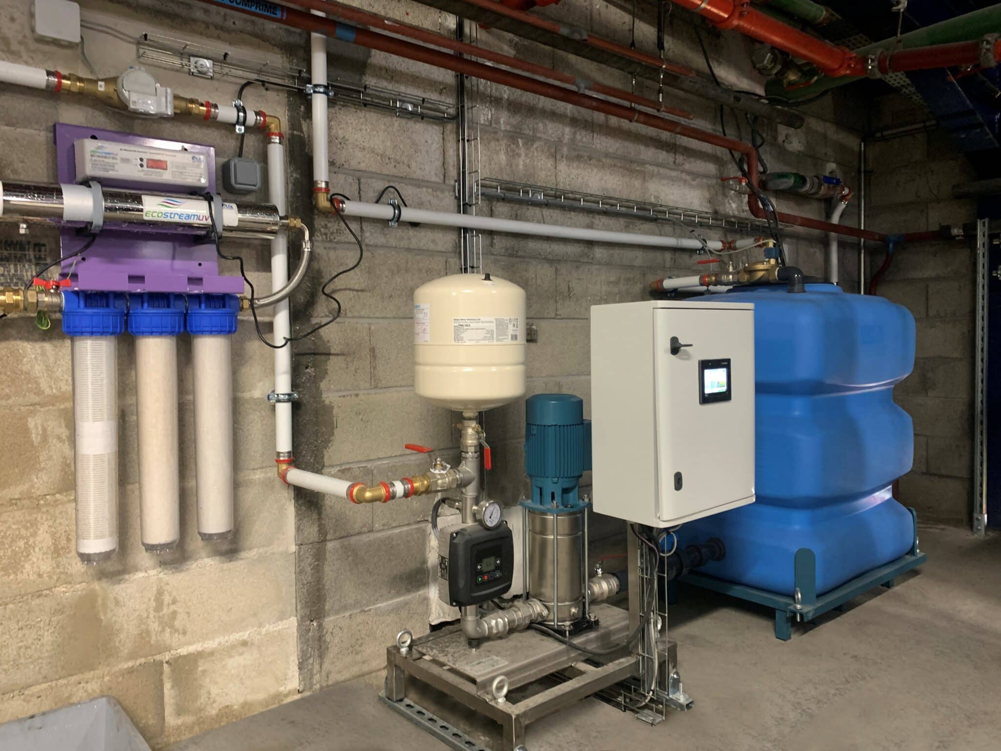 - Avec sa citerne de disconnexion de 2000 litres, le SKID (pré-assemblé en usine) sera installé dans le local technique du bâtiment. Il est muni d’un système automatisé de gestion du besoin mesure en temps réel la hauteur d’eau dans la citerne et bascule automatiquement en eau de ville en cas de besoin,