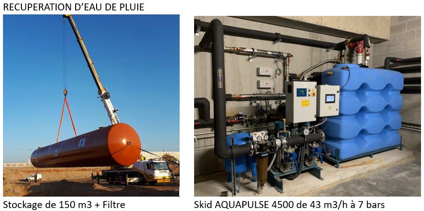 - L’adduction d’eau est assurée par un SKID de 43 m3/h, 60 HMT installé par les équipes d’EIMI ETUPES (25) ; modèle AQUAPULSE 4500 (initialement développé et installé au magasin IKEA de MULHOUSE),