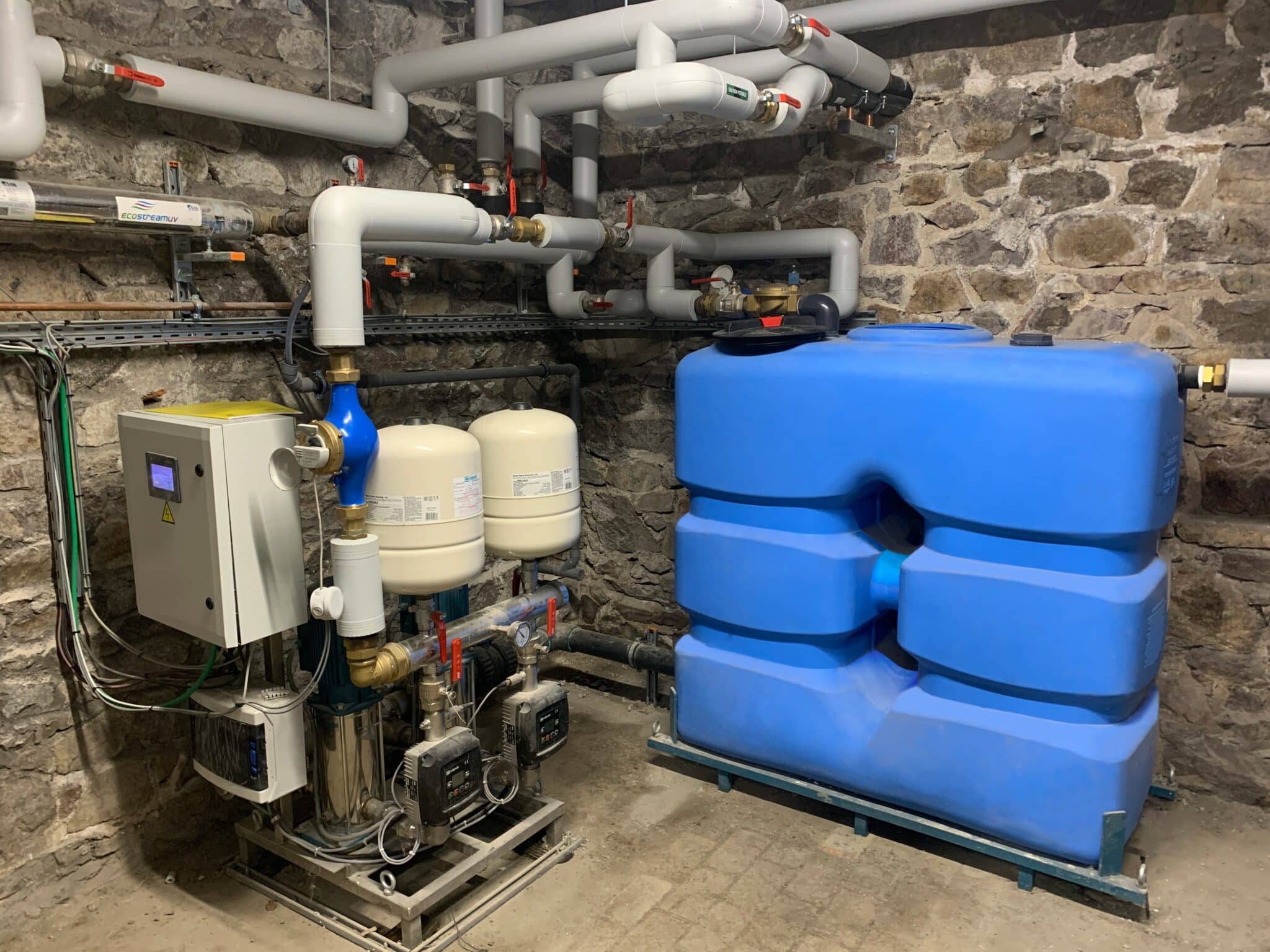 - À l’aide d’une pompe de relevage immergée dans une cuve, l’eau de pluie est envoyée vers un SKID compact (point de fonctionnement : 3.5m3/h à 4.2 bars) installé par AQUATAIR (74),